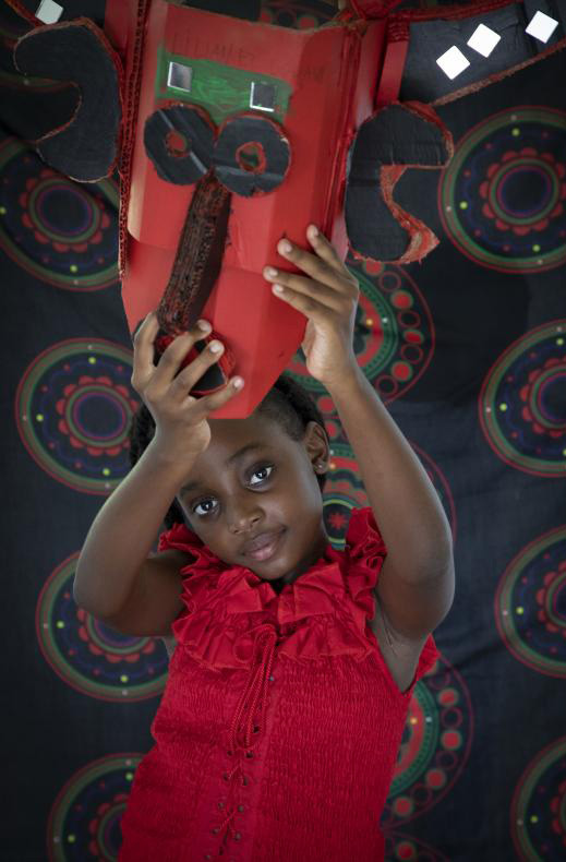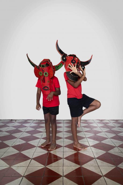 La semaine suivante, je fais venir un fabricant de masques qui aide les enfants à réaliser leur masque de carnaval dans la tradition créole. Ils utilisent leur production pour incarner leur personnage lors des ateliers photo qui suivent la confection. À l’image de la tradition des contes aux Antilles où l’oralité a toute son importance, je fais aussi intervenir un conteur et une danseuse pour stimuler l'imaginaire des élèves et travaillerl'expression corporelle. Exercice utile pour se sentir plus à l'aise lors des prises de vue. J'aborde avec les enfants, la notion d’identité de groupe et de la culture créole. Au fil des prises de vue, on travaille le rapport image et textes en questionnant ce qui fait l'identité de la Martinique. Dans un second temps, on aborde leur identité individuelle, ce qu'ils aiment, ce que signifie pour eux être martiniquais.